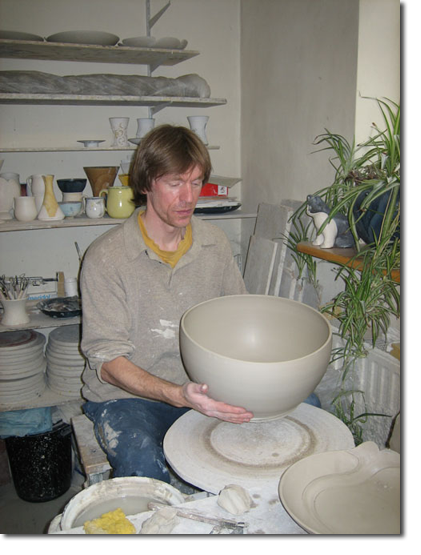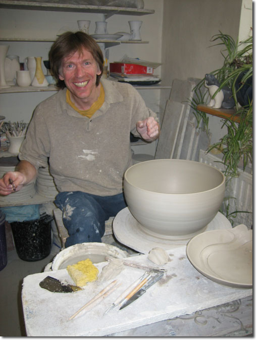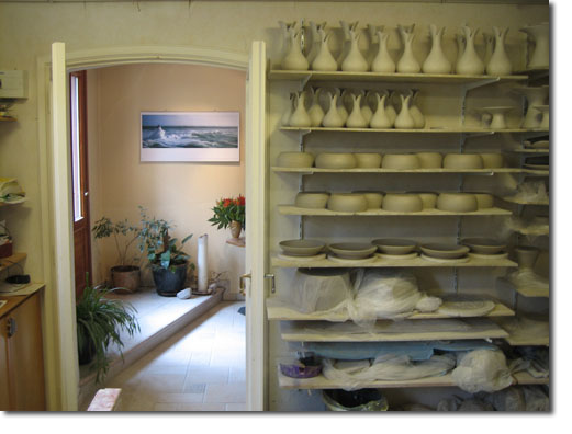 Die Werkstatt... Alle Objekte bestehen aus Feinsteinzeug, das bei 1240°C gebrannt wird. Für die Glasuren benutze ich nur lebensmittelechte, ungiftige Farben - kein Blei und Cadmium. |